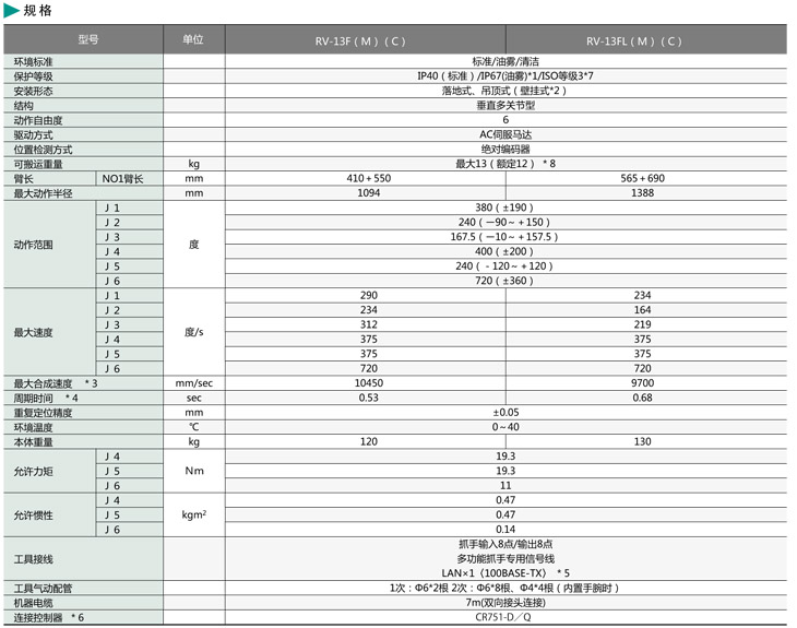 可搬重量增至13kg的高可搬RV-F系列全新登场。通过最新的伺服调控、横臂结构的最优化,实现高速•高精•高效的动作。最适台的臂长与更宽阔的6轴关节可动范围,可应对广泛的版面布局。通过耐环境规格,无需选择设置环境,也可适用于多种用途。多连抓手、多功能抓手等均可从容使用,也可应对大负荷机械零件的搬运、电气零件的组装、医药装箱等作业。