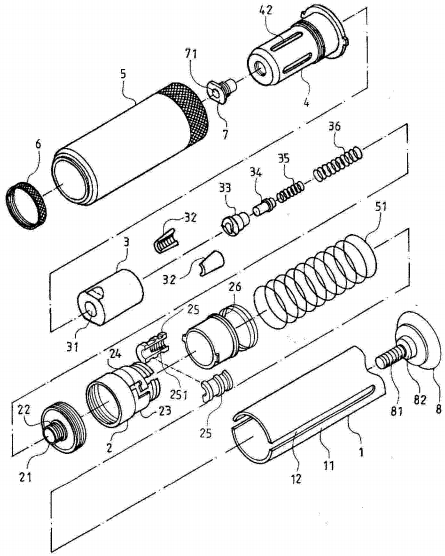 内管导套连接电钻传动轴,外管导套锁住其他部件,中间有弹簧提供弹力。