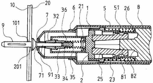 前端有弹簧和牙片(类似小夹子),能紧紧抓住铆钉的杆体。