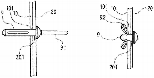 铆钉在孔内被挤拉变形,形成“蘑菇头”状的定位突垣(固定铆钉的关键结构)。